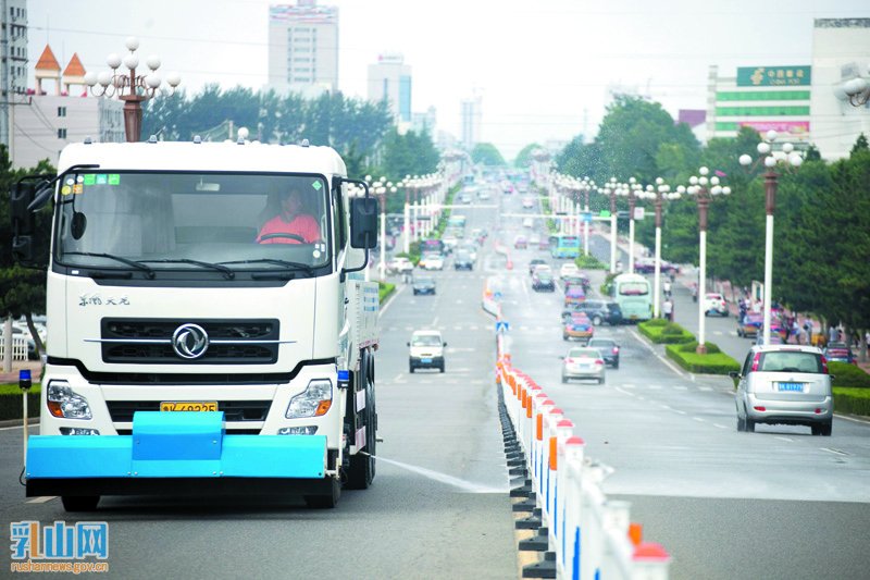 昨日,一辆高压清洗车在胜利街洒水作业。炎炎夏日,市环卫处使用高压洒水车每日对市区干道进行轮流喷洒,在清洁路面的同时,还可起到显著的降温作用。(记者 辛戈 摄)