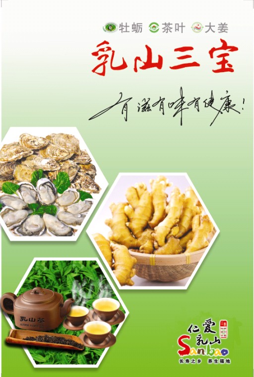 乳山是中国江北最大的牡蛎生产区、山东主要的优质大姜生产区、中国纬度最高的露天茶叶生产基地。乳山牡蛎个体大、肥度高、肉质好、味鲜美,含锌量极高,对人体健康非常有利。乳山大姜种植以沙壤土为主,产出的大姜姜体肥胖、色泽金黄,含粗纤维少、口感细嫩,含有多种对人体有益的营养成分。乳山绿茶叶片厚、营养丰富,含有大量适合人体健康的茶多酚、氨基酸等物质,具有滋味醇厚、清香久长、耐冲耐泡等特点。乳山牡蛎、乳山大姜、乳山绿茶先后获准国家地理标志认证,对外实行统一品牌、统一包装、统一销售。